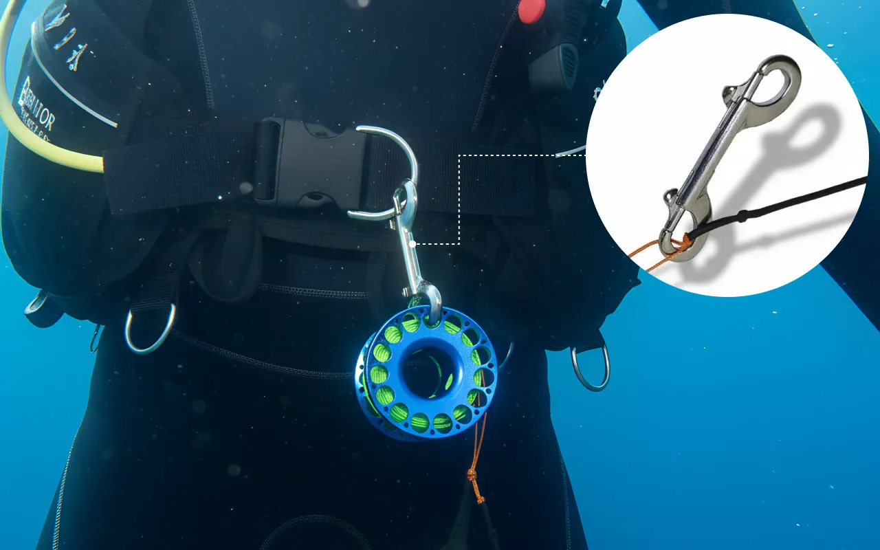 Rask klips av bolt snap-krok i rustfritt stål til D-ringen din. Ingen knot, så du kan fokusere på din undervannsopplevelse.