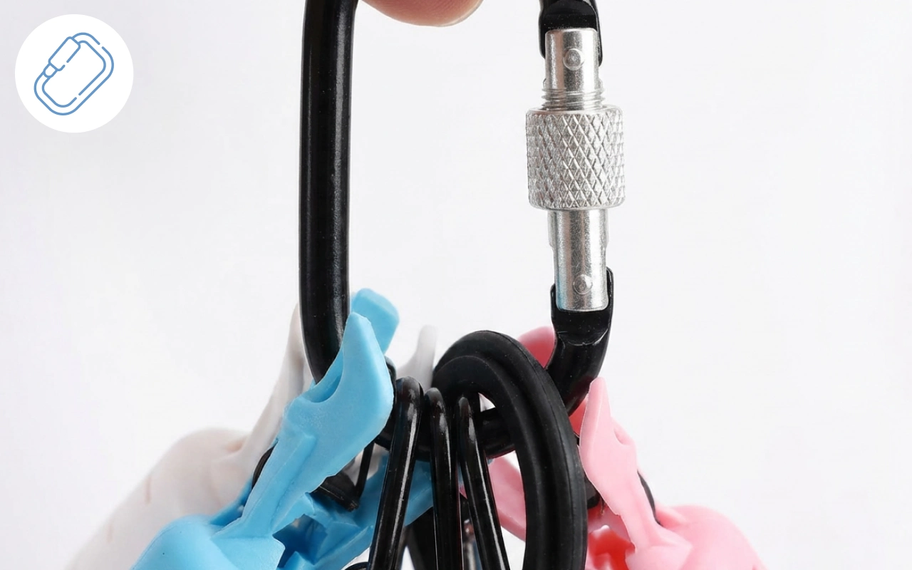 Jeg fester alle seks dekslene til karabineren og henger dem på slukveska. De klikkes raskt over krokene og hindrer alt i å floke seg sammen.