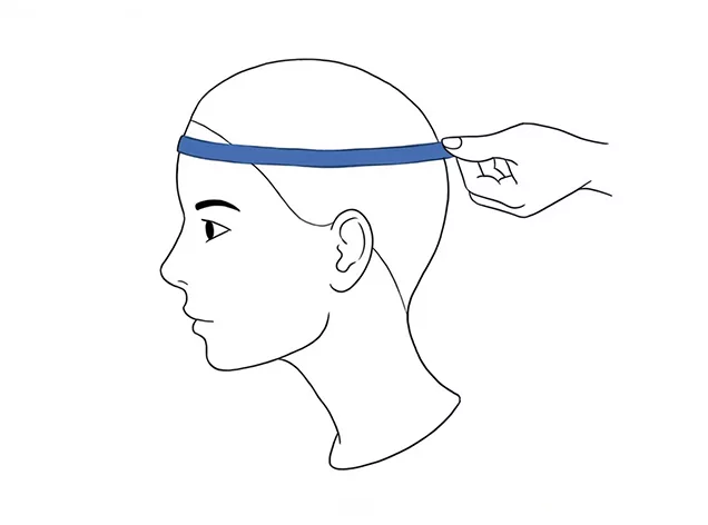 - 2. Surr målebåndet rundt hodet, plasser det like over øyenbryn og ører, og rundt den bredeste delen på baksiden av hodet.