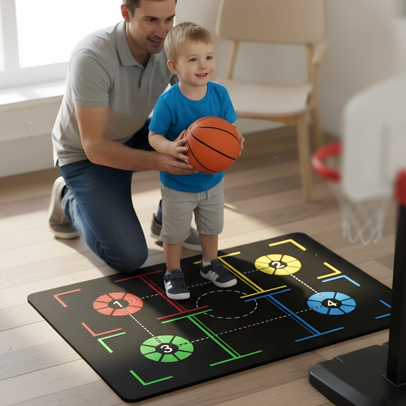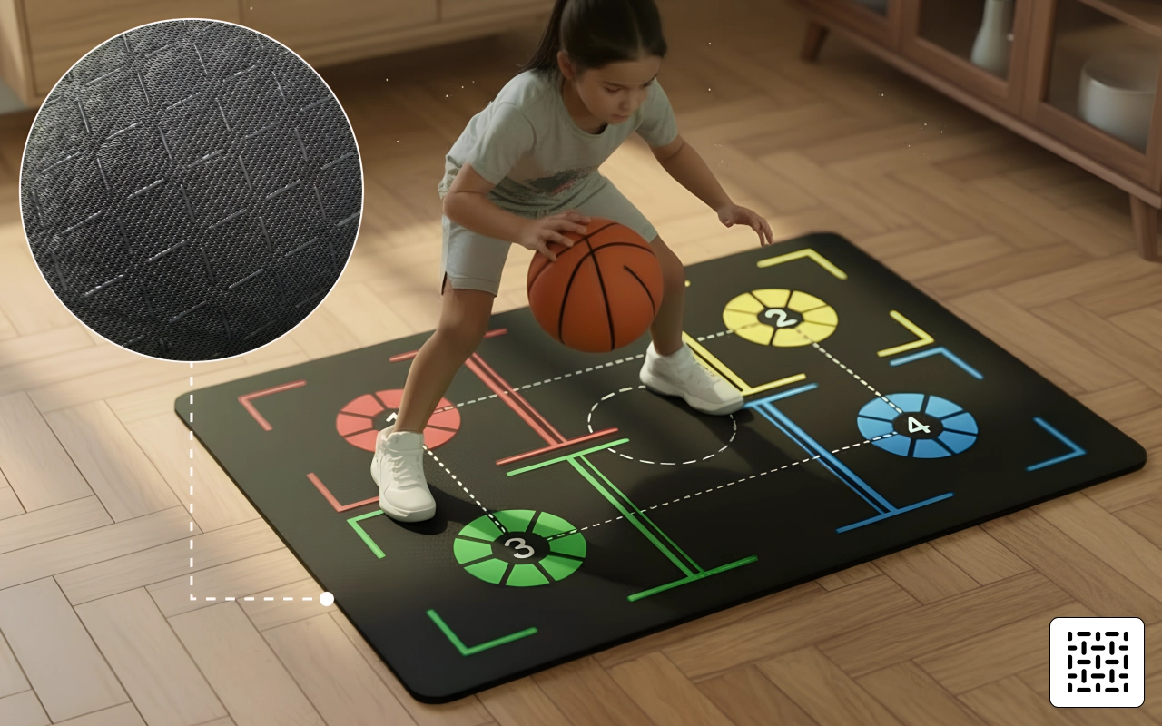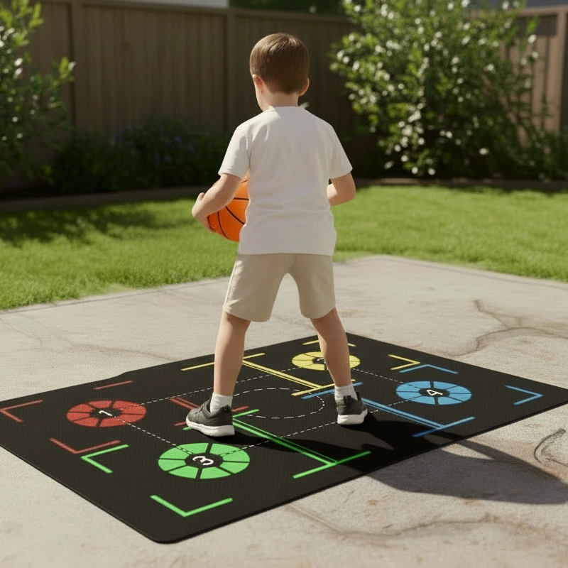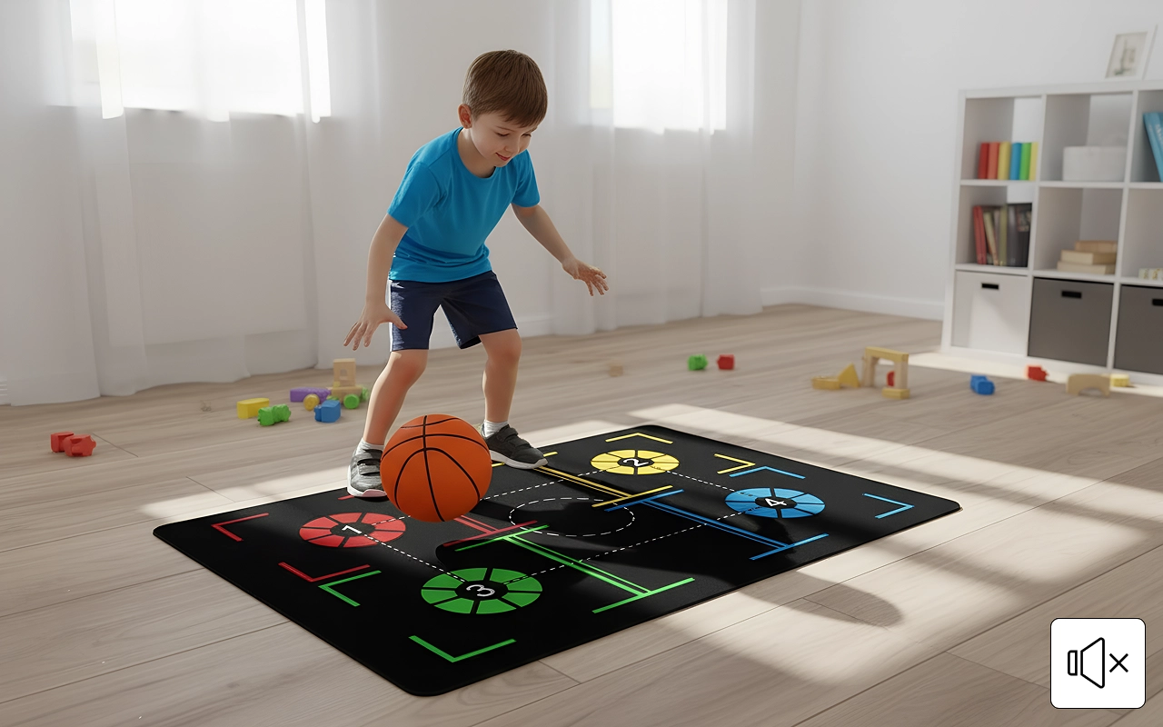 Sonene på matten hjelper meg å lære hvor jeg skal plassere føttene. Jeg kan øve på dribling stille om natten uten å vekke lillebroren min.
