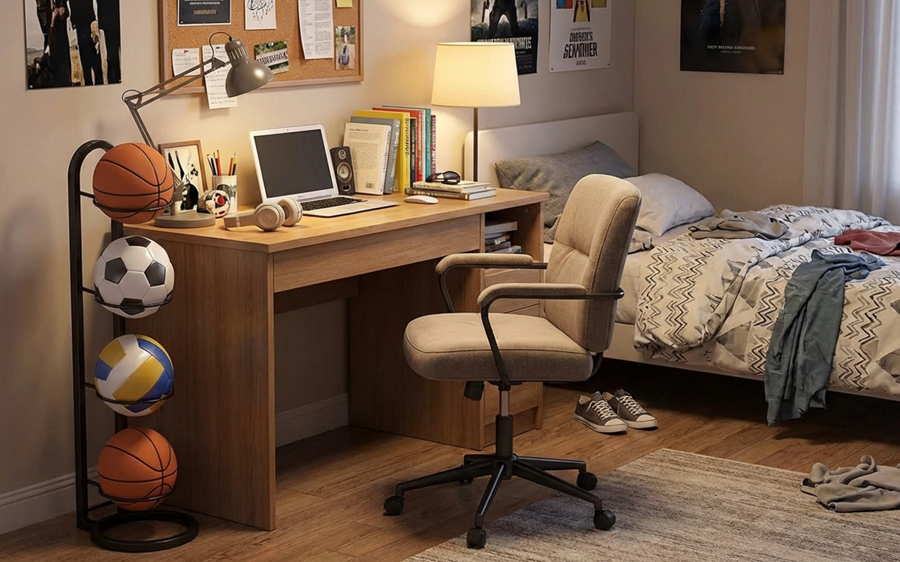 Tenåringssønnen min har altfor mange sportsballer. Dette stativet var lett å sette sammen, uten verktøy, og nå ligger ikke alt og ruller rundt overalt.
