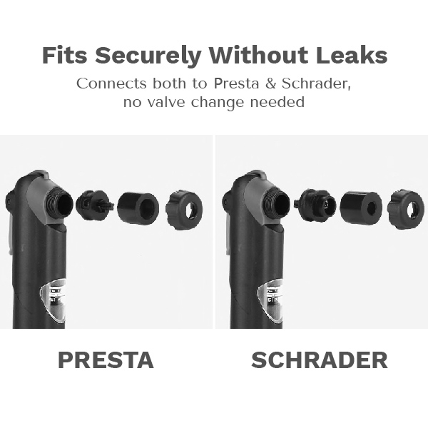 Denne kompakte pumpen er designet for å følge med på turen — enten den ligger i lommen din eller er festet til sykkelrammen. Den er laget for å fungere med både Presta (landevei- og ytelsessykler) og Schrader (terrengsykkel, barnesykkel) ventiltyper. Det tar bare noen sekunder og krever ingen verktøy — for å bytte mellom de to typene. Denne pumpen er koblet direkte til ventilen, uten behov for montering eller ekstra slange. Den benytter et høyvolum-design som pumper både på trykk og trekk. Pumpen er vurdert opp til 120 psi.