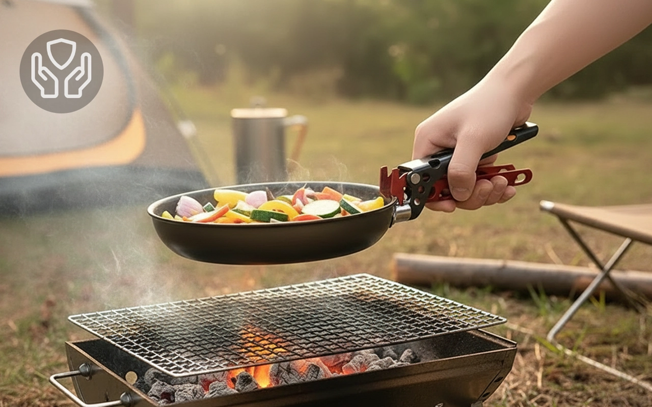 Threo-griperen beskytter fingrene dine når du løfter varme panner. Aluminiumlegering forblir sterk i alle situasjoner utendørs. Perfekt for campingturen eller kjøkkenkrisen.