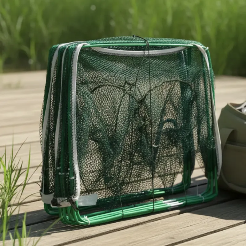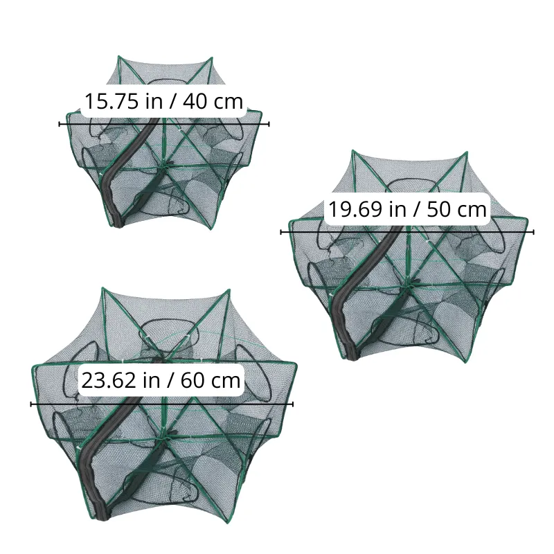 Takket være et trekkspill-lignende mekanisme kan vår fiskefelle foldes sammen til en mindre størrelse. Bær den enkelt i utstyrsvesken eller oppbevar den når den ikke er i bruk.