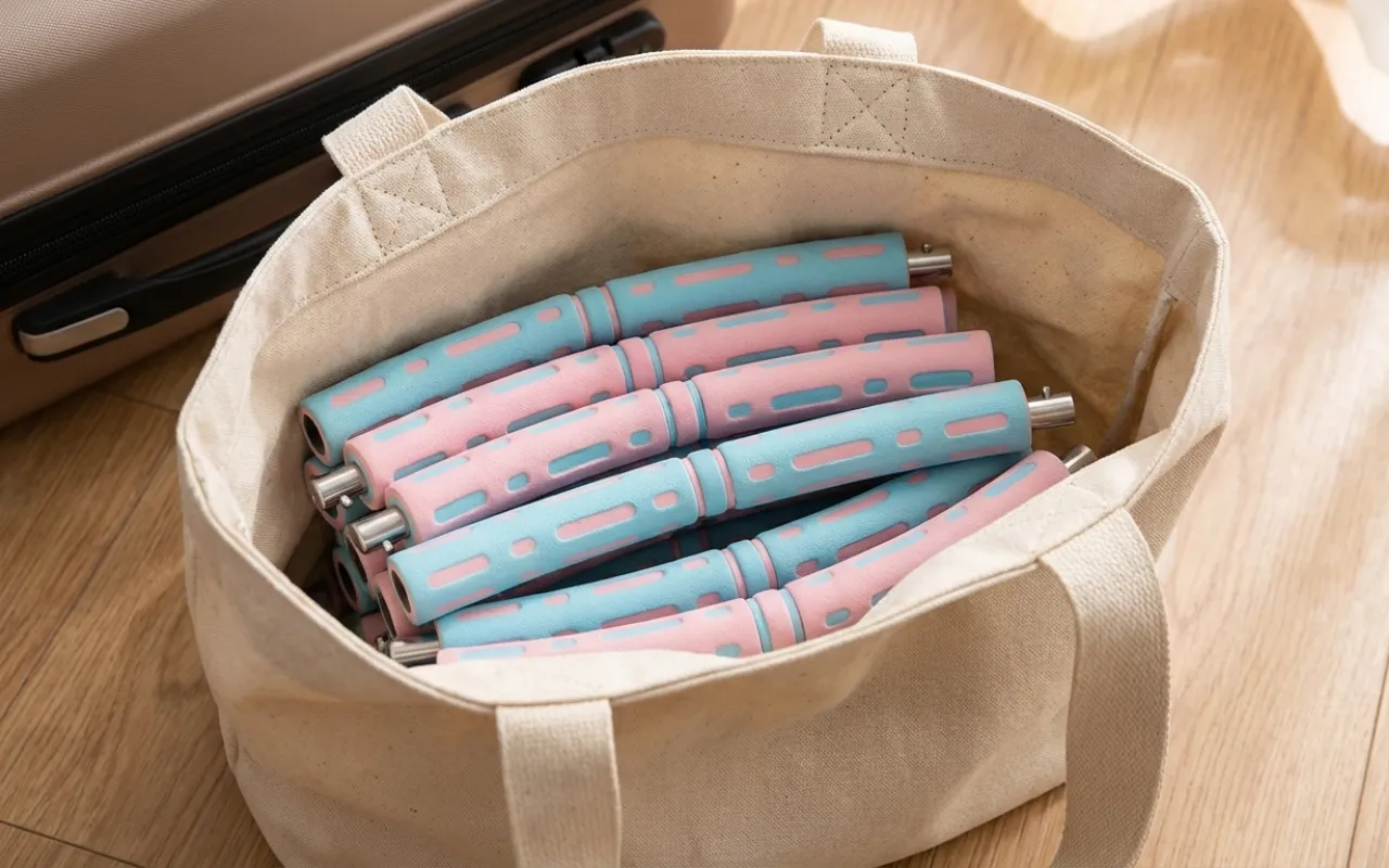 Knepp delene fra hverandre og oppbevar dem i vesken din. Ta med Threo Fitness Vektet Rockering hvor som helst uten styr.