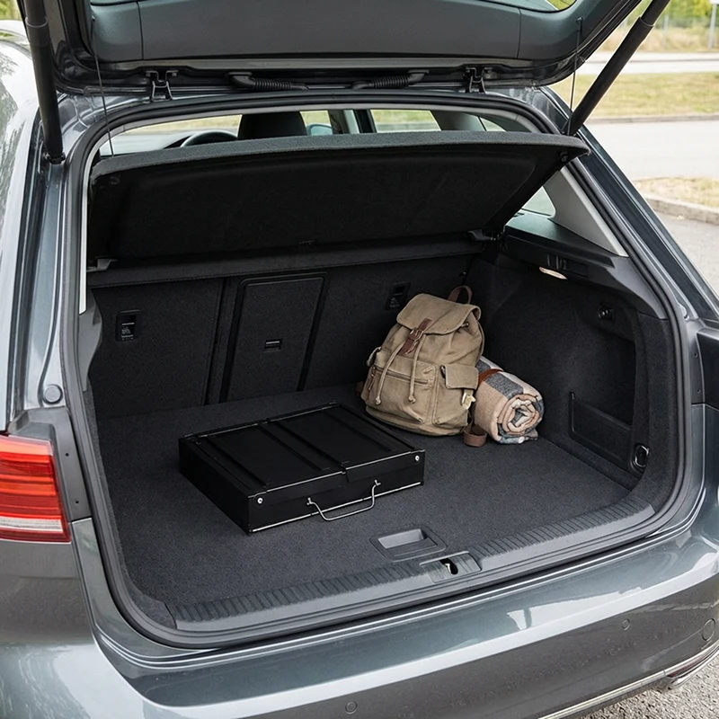 Vi tok med denne sammenleggbare grillen på biltur med barna. Den fikk plass under setet, ble slått ut på et øyeblikk, og oppryddingen etter pølser og mais var problemfri.
