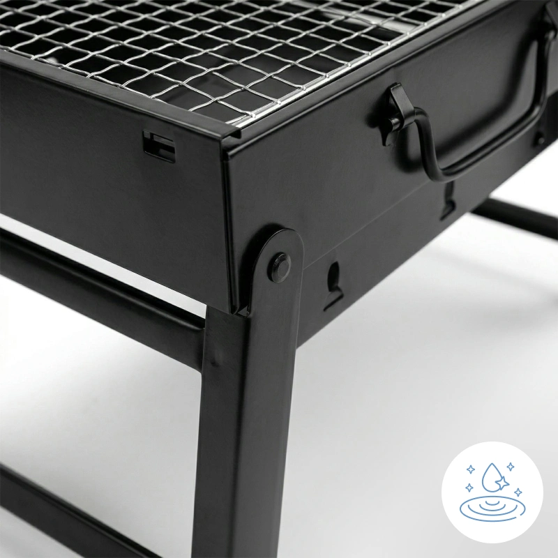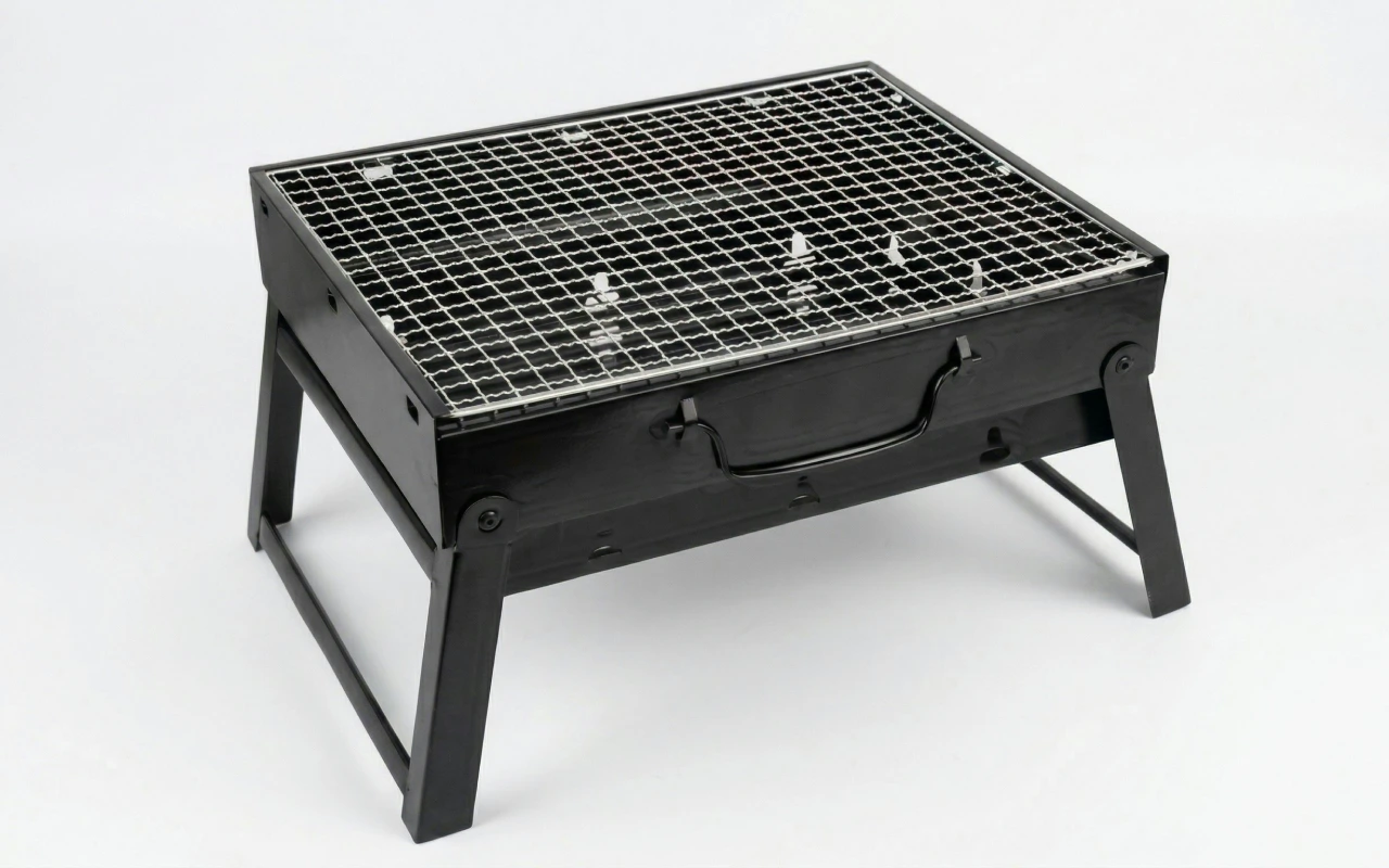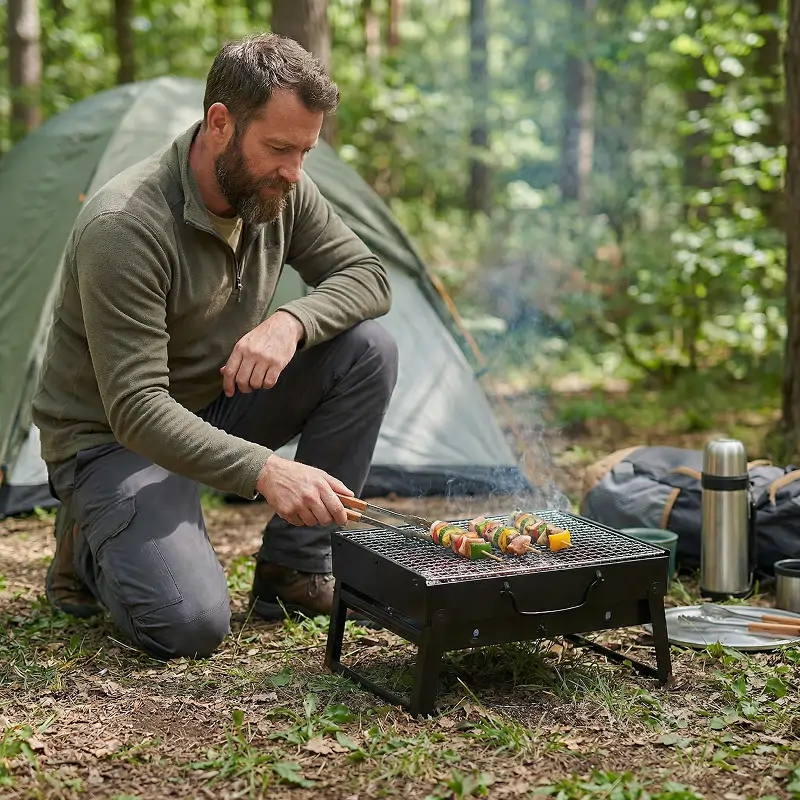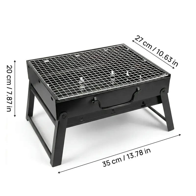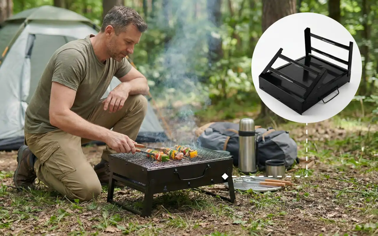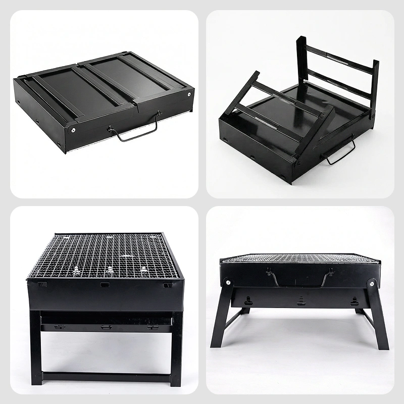 Kjøpte denne sammenleggbare grillen til strandturer med venner. Den varmes raskt opp, tar mange spyd, og den rustfrie overflaten blir ren bare med en fuktig klut.