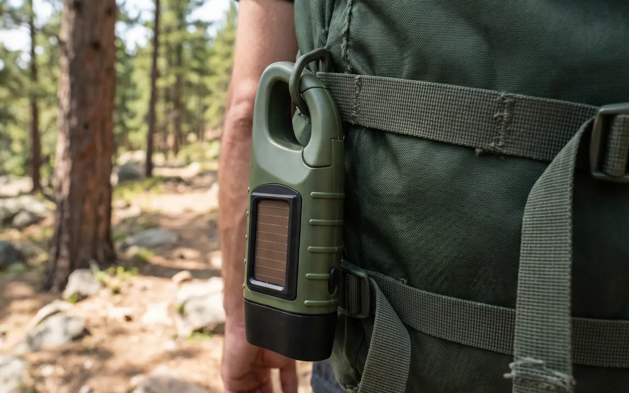 Jeg fester denne sollampen på ryggsekken når jeg går kveldsturer med hunden. Den lader i løpet av dagen og lyser sterkt opp både sti og vei.