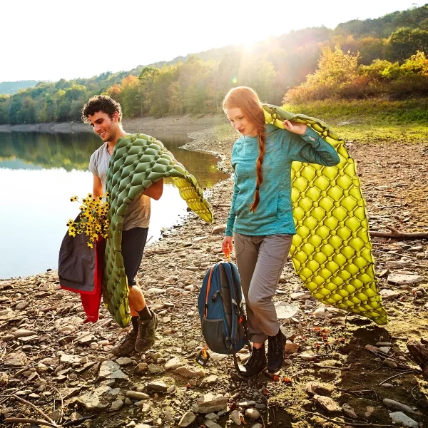 For å holde deg komfortabel mens du hviler på bakken, har dette liggeunderlaget en tykk 6,5 cm myk skummatte med en varm overflate designet for utendørs bruk. Liggeunderlaget er laget av materialer av høy kvalitet: dobbel lag laminering, TPU Nylon stoff og slitesterk vanntett belegg. Med tanke på kravene til nakken, følger det også med en ergonomisk pute for å gi en behagelig hodepute. Det innovative sekskantede luftkammerdesignet fordeler trykket for å støtte kroppen din.
