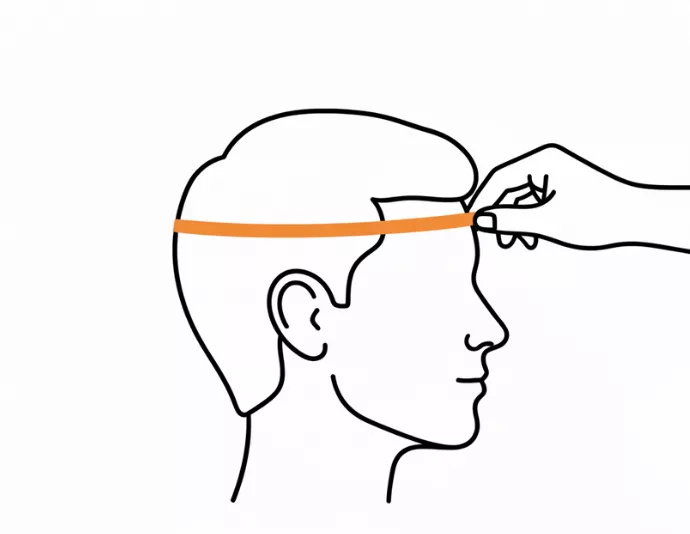 - 1. Pakk målebåndet rundt den bredeste delen av hodet, like over øyenbrynene og ørene.