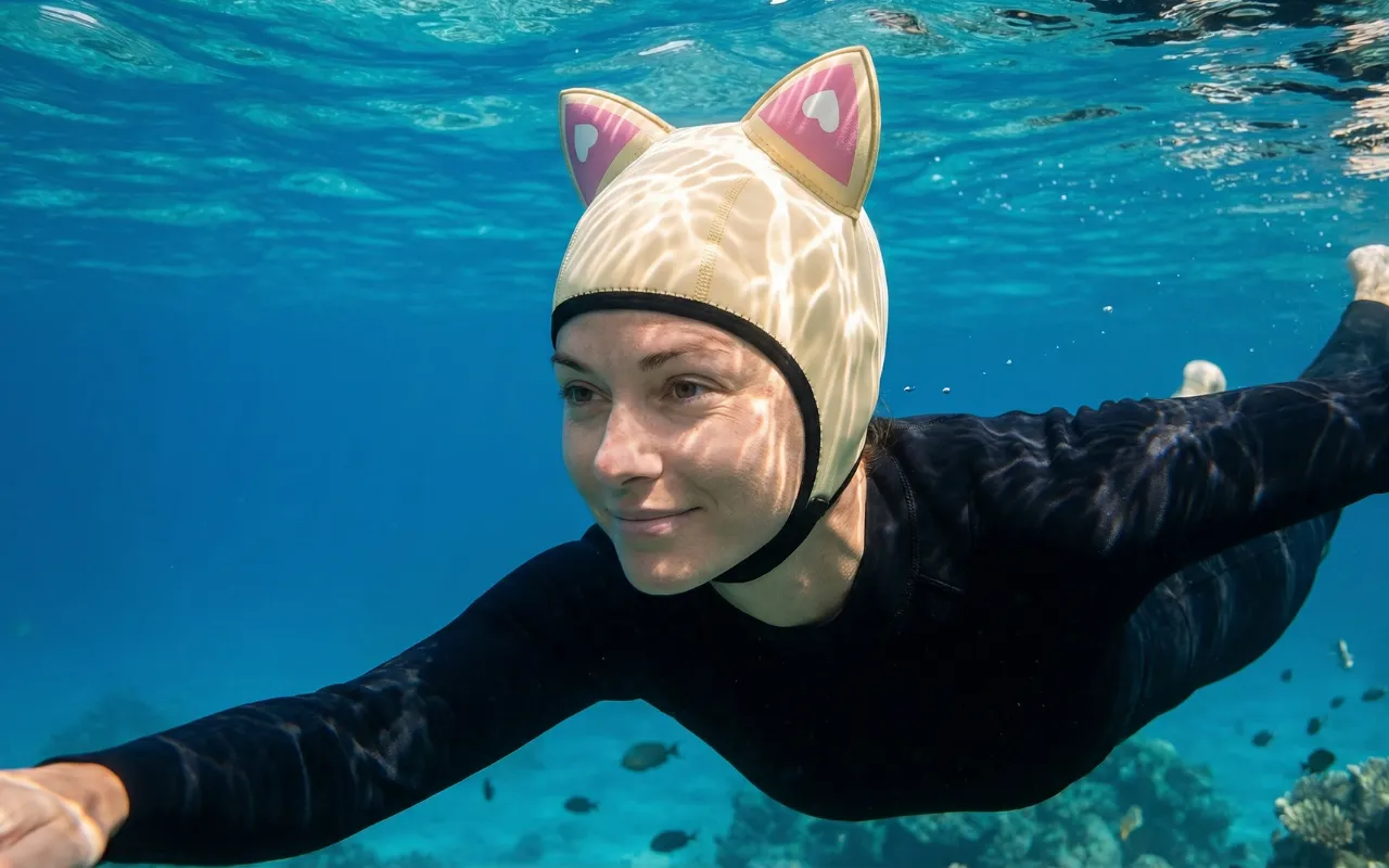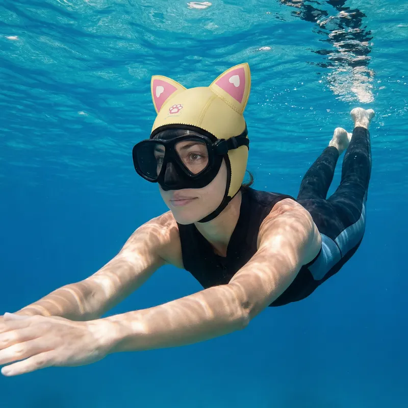 Ikke mer bustete hår eller kaldt hode etter dykketrening. Søsteren min vil også ha en fordi katteørene ser så kule ut!