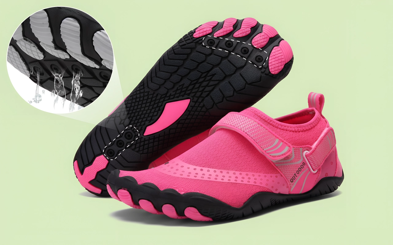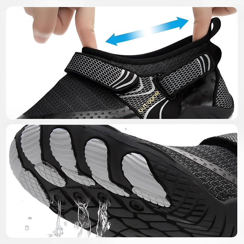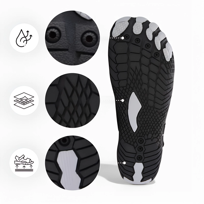 Spesielle såler hindrer uønsket glidning eller fall på vått underlag. Føl deg trygg mens du går, svømmer eller utforsker steinete stier.