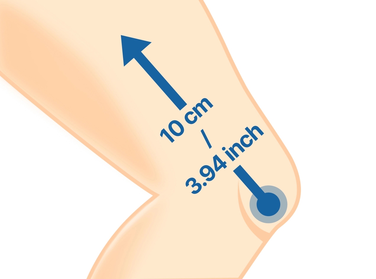 - 2. Pakk målebåndet rundt den bredeste delen av låret ca. 10 cm/3,9" over midten av kneskålen.