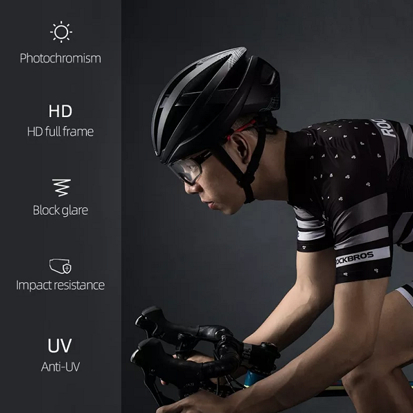 THREO Fotokromatiske Sykkelbriller beskytter synet ditt perfekt mot sollys. Linsene justerer automatisk mørkhets- og lysstyrkenivået basert på ulike grader av ultrafiolett stråling. I tillegg tilbyr brillene våre en perfekt tilpasning til alle lys- og værforhold. Takket være denne teknologien trenger du aldri å bytte briller under ulike utendørsaktiviteter. Videre gir de brede linsene et større synsfelt og beskytter øynene dine mot vind, støv og mygg.