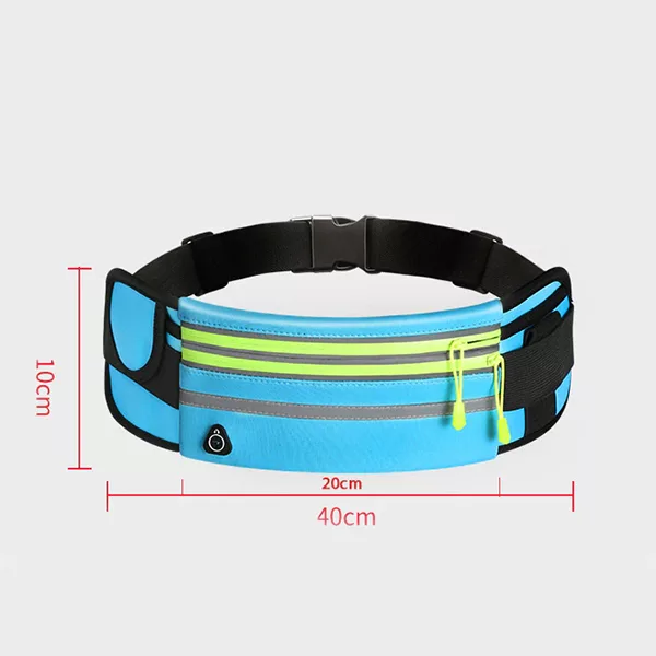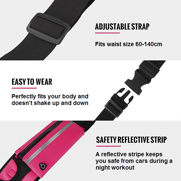 Løpevesken vår har en justerbar stropp som enkelt kan tilpasses midjemålet ditt. Den har også en refleksstripe foran. Når den eksponeres for lys i mørket, reflekterer den lyset tilbake til kilden, slik at du blir synlig i dårlig lys og forebygger bilulykker.