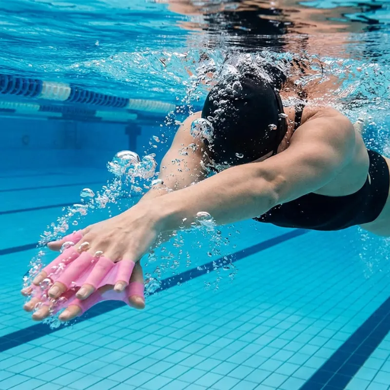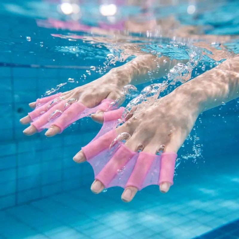 Selv i et lite hotellbasseng får jeg skikkelig trening med disse. Den myke silikonen strekker seg rundt hendene mine, og hvert tak sender meg glidende mye lenger enn vanlig.