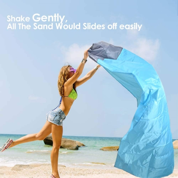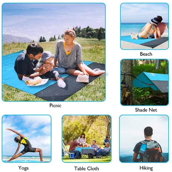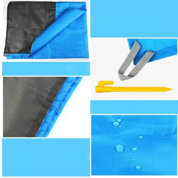 Dette vanntette utendørsteppe er laget av førsteklasses slitesterk ripstop fallskjerm-nylon og vil ikke rives eller slites uansett hvor hardt det gnis. Det leveres med en kompakt snorpose med karabinkrok — veldig lett og behagelig å bruke. På slutten av dagen bretter du enkelt dette strandteppet sammen til komprimert størrelse og pakker det i reiseposen. Teppet er pustende og maskinvaskbart, tørker raskt men falmer aldri. Det er utstyrt med 4 faste ankere, så du trenger ikke bekymre deg for at strandmatten skal bli forstyrret av vind og sand.