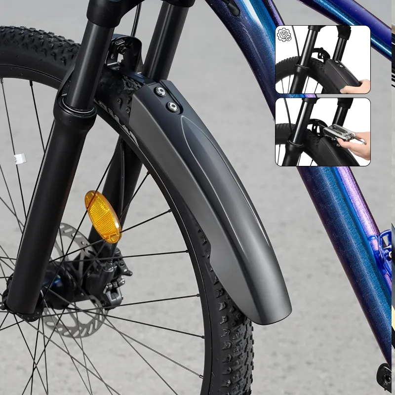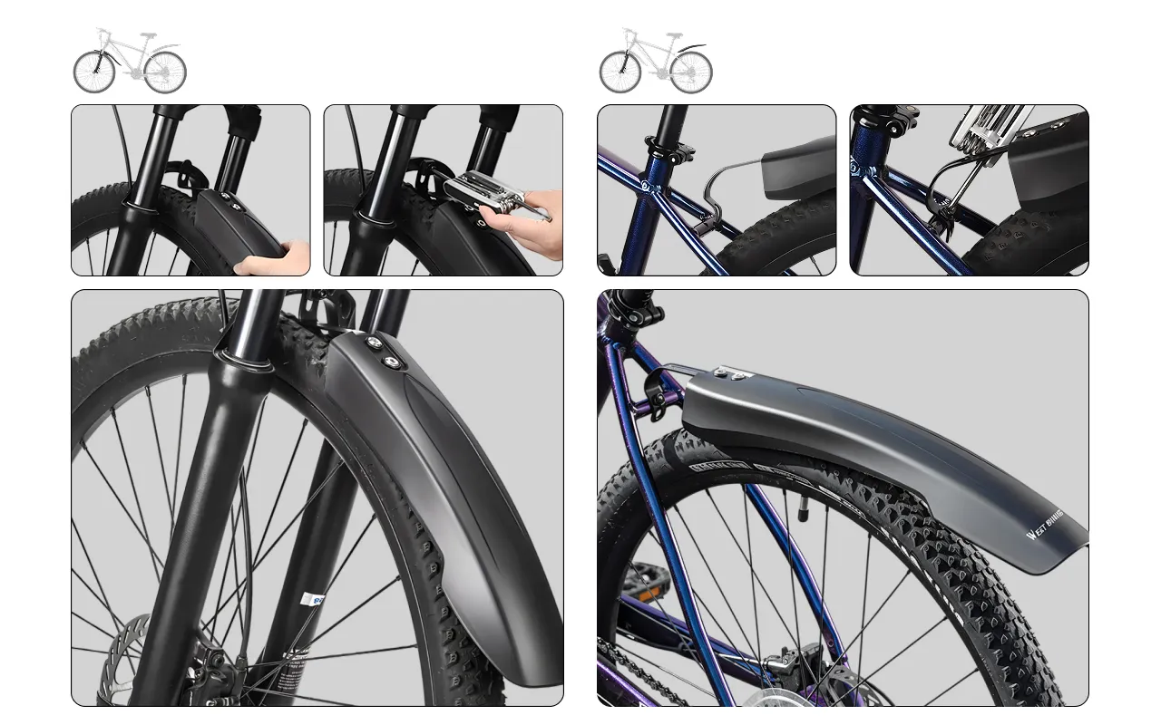 Threo skjermsett holder sykkelen og klærne dine rene på hver tur. Det hindrer søle og vann fra å sprute på hjulene. Skjermene beskytter viktige komponenter, forlenger levetiden og forbedrer sykkelens ytelse. Montering er enkel og lar deg feste skjermene raskt og uten stress.